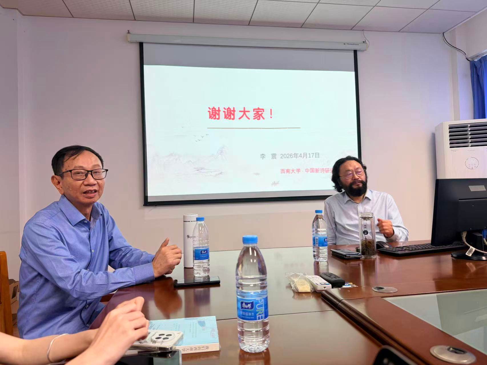 2026年4月17日15:00,西南大学光大讲坛暨社科大讲堂、吕进诗学讲坛第二十八讲在西南大学中国新诗研究所会议室(荟文楼807)顺利举行。本次讲座以“汉语诗学的人本主义传统”为主题,由陕西师范大学文学院教授、中国文艺评论家协会理论委员会主任李震主讲,西南大学中国诗学研究中心向天渊教授主持。重庆作协诗创委副主任吴向阳先生、浙江越秀外国语学院英语学院副教授钱志富先生、《重庆文艺》副总编辑王彦女士、渝州诗会会长黄干先生受邀参与,新诗所梁笑梅、张立新、程晋、杨晓瑞、许金琼等老师及硕博研究生30余人也出席了讲座。讲座围绕汉语诗学的文化哲学根基、诗学观、批评形态与方法及其对自主知识体系构建的意义展开探讨。