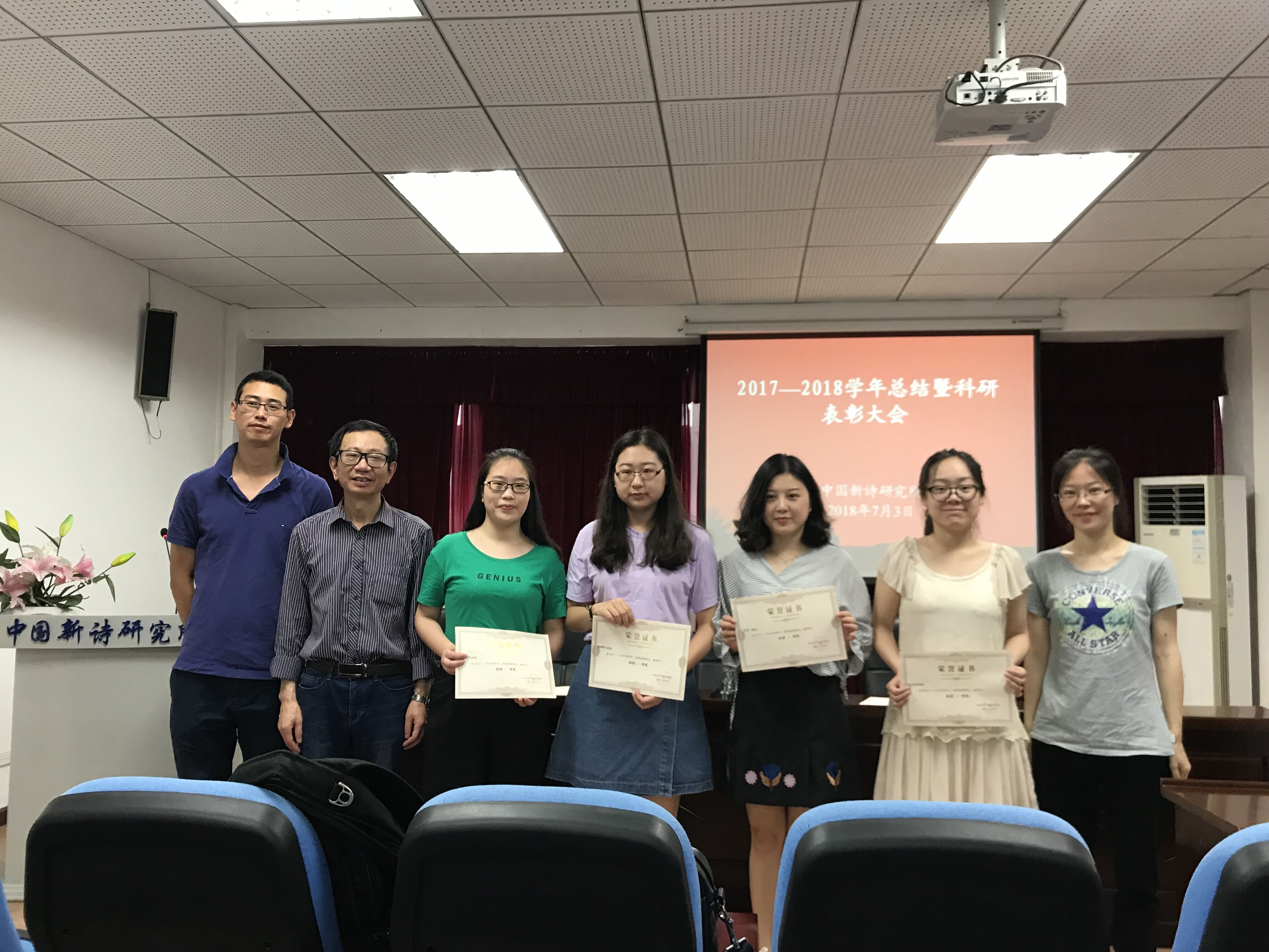 本次学年总结暨科研表彰大会不仅对新诗所全体同学在2017—2018学年学习情况进行了总结,也对下一学年的学习生活有所规划,希望中国新诗研究所全体同学在下一学年的学习和生活中,严于律己、坚持学习,创造新的成就!